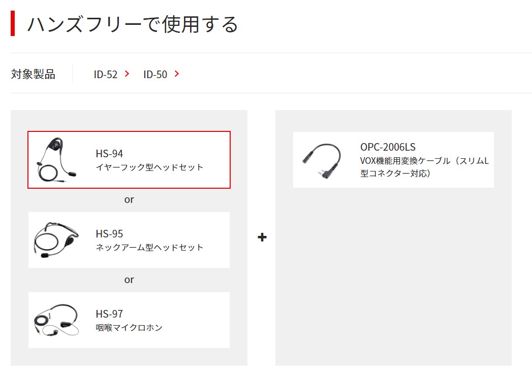 | ●喉の振動を拾って音声に変える小型咽喉マイク&イヤホンです。 ●周囲の騒音が激しい場所でもクリアに音声を送信します。 ●HS-97を使用するには別売りのOPC-2006LS(VOX機能用変換ケーブル(スリムL型コネクター対応)が必要です。 ※使用するオプションは無線機・トランシーバーによって異なります。 <諸元> ・コード長: 80cm ・プラグ形状: φ2.5mm |